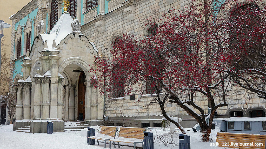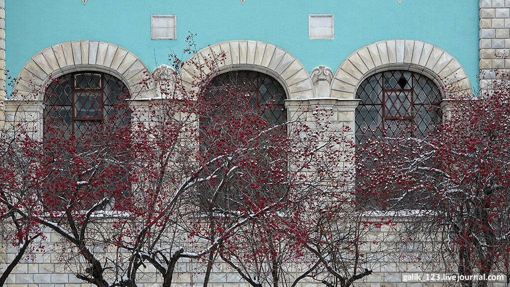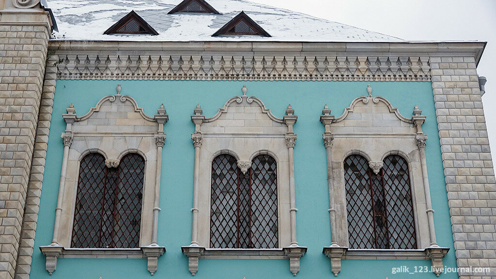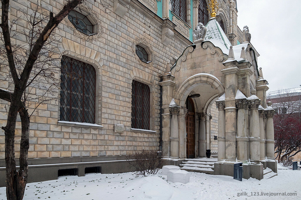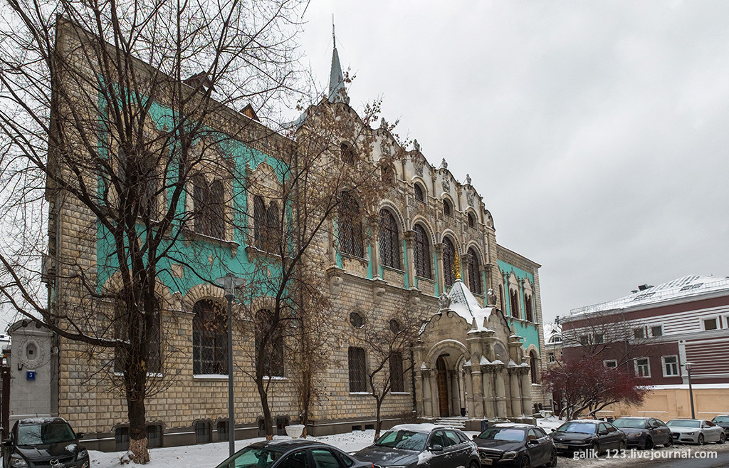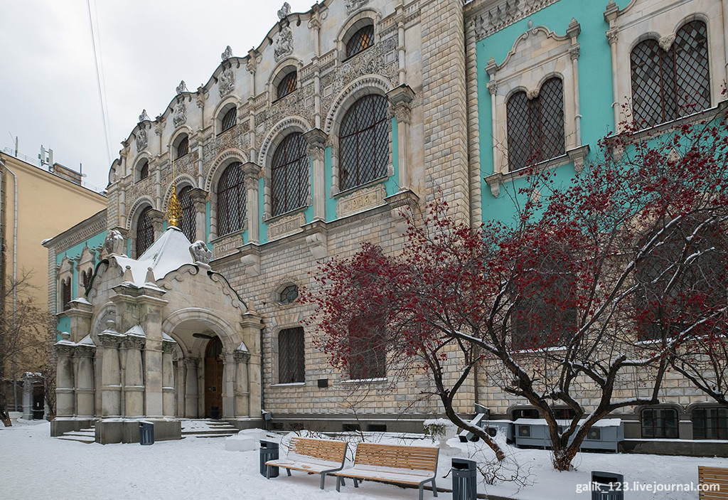 Если свернуть с Тверской в Настасьинский переулок, что напротив Английского клуба, то совсем скоро можно увидеть нарядное здание со множеством декоративных деталей на фасаде. Не включить его в мою коллекцию Самых красивых домов Москвы просто невозможно. Тем более, что удалось снять его целиком, хотя переулок довольно узкий. Дом этот выглядит совершенно сказочно, ничего похожего в самом центре Москвы нет. Формально в оформлении здания используются мотивы русского зодчества, так называемый неорусский стиль, но присутствуют и элементы других стилей. Левое и правое крылья здания напоминают терема с лазурными стенами. Углы здания облицованы рельефной кладкой, под названием бриллиантовый руст. Прекрасный образец эклектичного стиля...