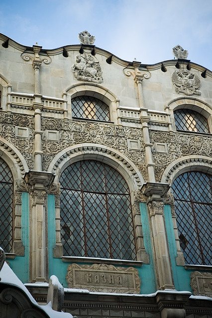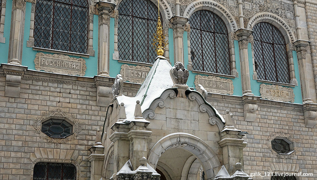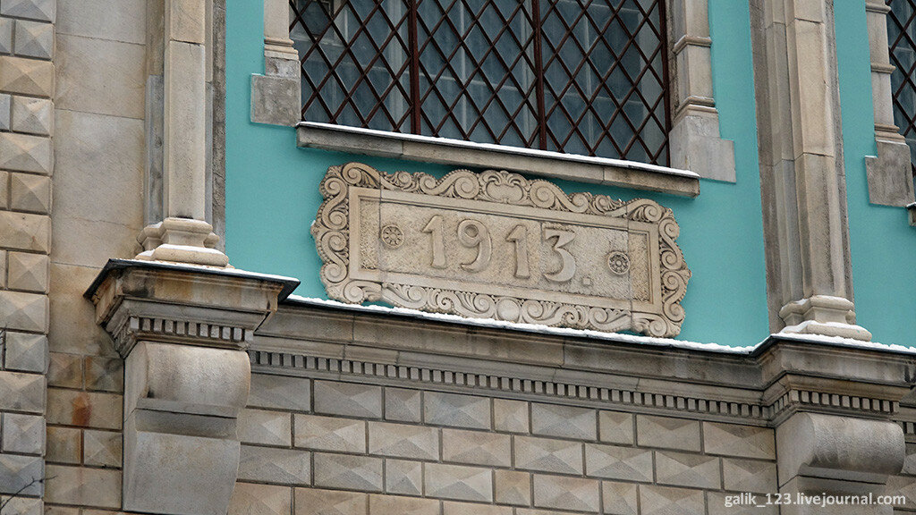 1. Надпись на фронтоне здания "Российская ссудная казна" говорит о его назначении, указаны и годы строительства. Здание было построено по проекту архитекторов В.А. Покровского и Б.М. Нилуса в 1913-1916 годах, до этого спроектировавших здание Госбанка в Нижнем Новгороде. Здание стало своеобразным памятником 300-летию Дома Романовых, а проект был лично одобрен императором.
