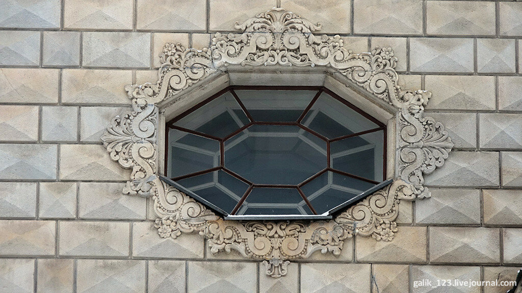 9. На фасаде под годом постройки и надписью расположены оригинальные восьмиугольные оконца - отсыл к барокко.