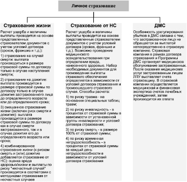 Рассматривая особенности определения величины ущерба и страховой выплаты по личному страхованию, следует учитывать, что для большинства его видов страховое обеспечение является обязательным и выплачивается независимо от того, что страхователю, застрахованному лицу или выгодоприобретателю причитаются выплаты и по другим видам страхования. К таковым можно отнести суммы, полученные от социального страхования, социального обеспечения, а также в порядке возмещения вреда. Причем размеры страхового обеспечения зависят от конкретного вида страхования, определяются только условиями конкретного договора и напрямую связаны со страховой суммой, установленной договором страхования. Жизнь человека абсолютно бесценна, поэтому страховая сумма по договорам личного страхования может быть сколь угодно высокой, и страховое обеспечение будет выплачено по всем договорам страхования, сколько бы их ни действовало на момент наступления страхового случая. Изучив механизм урегулирования убытков по личному страхованию в филиале ПАО «Росгосстрах» в Республике Мордовия, на рис. 2 представим схематично состав личного страхования и особенности расчета ущерба и величины выплаты каждой из представленных групп.