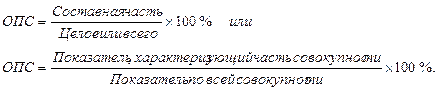 Выражаются ОПС обычно в виде долей единицы (коэффициентов) или процентах. Сумма удельных весов структурных частей исследуемой совокупности при этом должна быть равна соответственно единице или ста процентам.