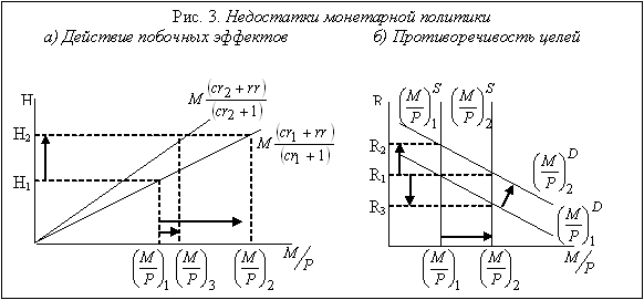 Наличие побочных эффектов, вызываемых изменением предложения денег, которые также снижают эффективность монетарной политики. Так, если центральный банк увеличивает денежную массу, то ставка процента падает, т.е. снижаются альтернативные издержки хранения наличных денег. В этих условиях население может предпочесть перевести средства с депозитов в наличность, что уменьшит норму депонирования (коэффициент cr, равный отношению наличности к депозитам (cr = C/D)). Одновременно падение ставки процента (цены кредита) снижает заинтересованность коммерческих банков выдавать кредиты, увеличивая их избыточные резервы (excess reserves), что сказывается на величине нормы резервирования (коэффициента rr, равного отношению резервов к депозитам (rr = R/D) и представляющего собой сумму нормы обязательных резервов (ur), устанавливаемой центральным банком, и нормы избыточных резервов (er), определяемой самими коммерческими банками (rr = ur + er)). Рост нормы депонирования и нормы резервирования ведет к снижению величины денежного мультипликатора, что существенно ослабляет эффект воздействия монетарного импульса на экономику (рис. 3.(а)). Рост денежной базы от Н 1 до Н 2 может привести к росту денежной базы от М 1 до М 2 , если не меняется величина мультипликатора, и лишь до М 3 , если происходит уменьшение величины денежного мультипликатора вследствие роста нормы депонирования (как в данном случае) и/или нормы резервирования.